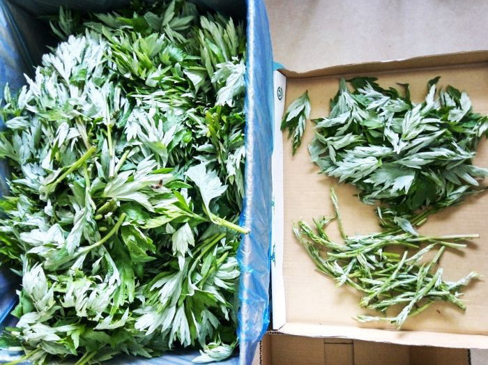 「ヨモギ」の穂先から10cmほどまでの柔らかい葉っぱだけを使います。